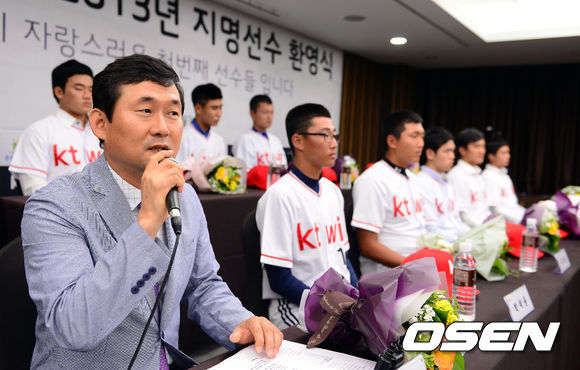 KT 주영범 단장이 지옥훈련을 예고했다. 주 단장은 26일 서울 르네상스 호텔에서 열린 ‘수원 KT 위즈 2013년 지명선수 환영식’에서 “선수 지명이 우리 예상대로 돼서 만족스럽다. 조범현 감독은 코피 터질 정도로 연습시키시는 분인데 우리 구단이 과연 이번 지명 선수들이 오고 싶은 구단인지 모르겠다”고 웃었다.