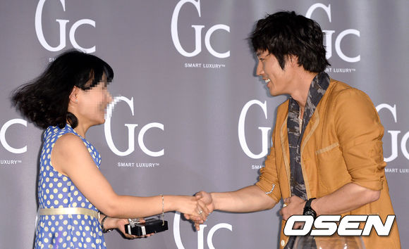 배우 장혁이 이벤트에 당첨된 여성팬에게 선물을 건네고 있다.