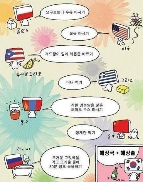 최근 한 온라인 커뮤니티에는 ‘나라별 해장 해법’ 설명이 실린 사진이 게시됐다. ‘나라별 해장 해법’은 음주로 지친 몸을 달래는 각 나라의 저마다의 해법이 공개돼있다.
