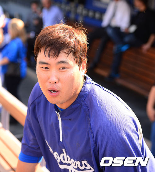 27일 (이하 한국시간) 미국 캘리포니아주 로스앤젤레스 다저스타디움에서 2013 메이저리그 LA 다저스와 시카고 컵스의 경기가 열릴 예정인 가운데, 경기 전 훈련시간에 류현진이 박한별과의 열애설에 대한 질문에 쑥스럽게 답하고 있다.