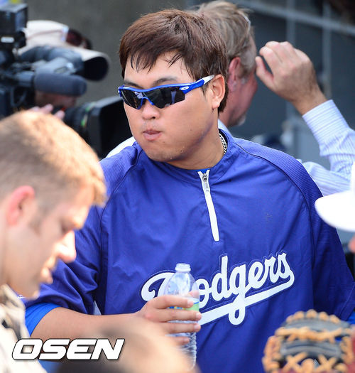 27일 (이하 한국시간) 미국 캘리포니아주 로스앤젤레스 다저스타디움에서 2013 메이저리그 LA 다저스와 시카고 컵스의 경기가 열릴 예정인 가운데, 경기 전 훈련시간에 류현진이 박한별과의 열애설에 대한 질문을 받고 물을 마시던 중 뿜을 뻔하고 있다.