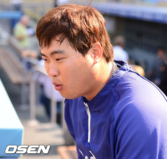 27일 (이하 한국시간) 미국 캘리포니아주 로스앤젤레스 다저스타디움에서 2013 메이저리그 LA 다저스와 시카고 컵스의 경기가 열릴 예정인 가운데, 경기 전 훈련시간에 류현진이 박한별과의 열애설에 대한 질문에 쑥스러워 하고 있다.