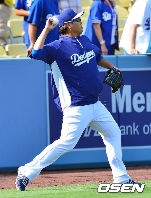 27일 (이하 한국시간) 미국 캘리포니아주 로스앤젤레스 다저스타디움에서 2013 메이저리그 LA 다저스와 시카고 컵스의 경기가 열릴 예정인 가운데, 경기 전 훈련시간에 류현진이 캐치볼을 오른손으로 던지고 있다.