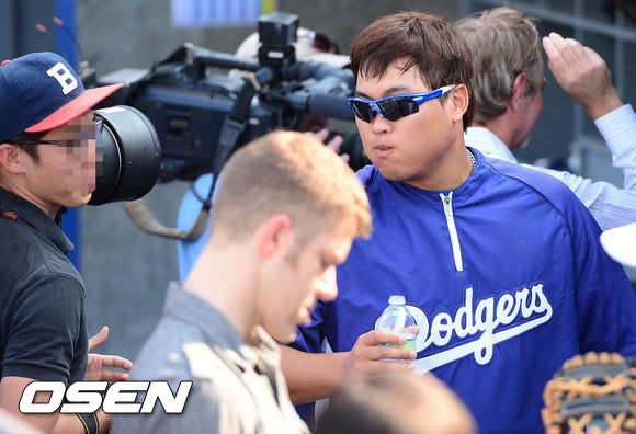 27일 (이하 한국시간) 미국 캘리포니아주 로스앤젤레스 다저스타디움에서 2013 메이저리그 LA 다저스와 시카고 컵스의 경기가 열릴 예정인 가운데, 경기 전 훈련시간에 류현진이 박한별과의 열애설에 대한 질문을 받고 물을 마시던 중 뿜을 뻔하고 있다.