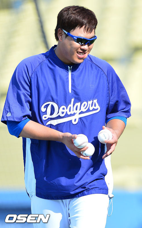 27일 (이하 한국시간) 미국 캘리포니아주 로스앤젤레스 다저스타디움에서 2013 메이저리그 LA 다저스와 시카고 컵스의 경기가 열릴 예정인 가운데, 경기 전 훈련시간에 류현진이 볼 정리 하며 미소짓고 있다.