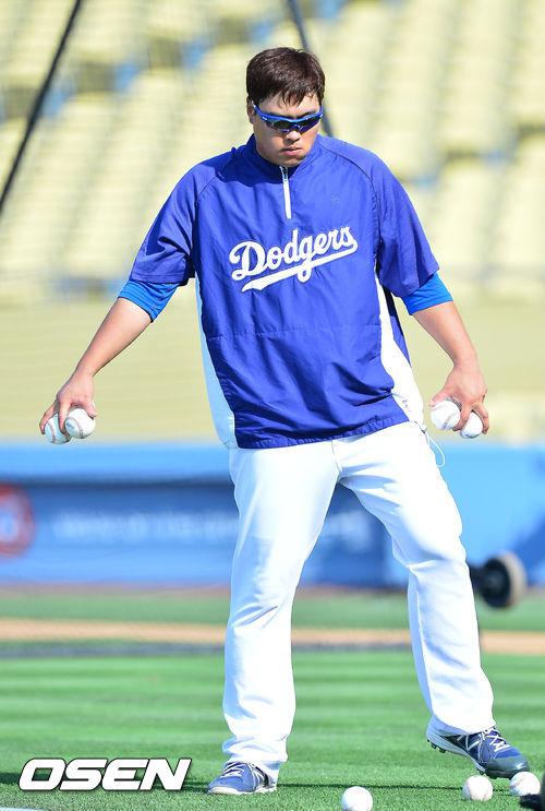 27일 (이하 한국시간) 미국 캘리포니아주 로스앤젤레스 다저스타디움에서 2013 메이저리그 LA 다저스와 시카고 컵스의 경기가 열릴 예정인 가운데, 경기 전 훈련시간에 류현진이 볼 정리를 하고 있다.