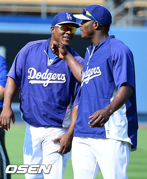 27일 (이하 한국시간) 미국 캘리포니아주 로스앤젤레스 다저스타디움에서 2013 메이저리그 LA 다저스와 시카고 컵스의 경기가 열릴 예정인 가운데, 경기 전 훈련시간에 유리베와 푸이그가 장난을 치고 있다.