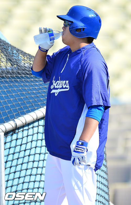 27일 (이하 한국시간) 미국 캘리포니아주 로스앤젤레스 다저스타디움에서 2013 메이저리그 LA 다저스와 시카고 컵스의 경기가 열릴 예정인 가운데, 경기 전 훈련시간에 류현진이 물을 마시고 있다.