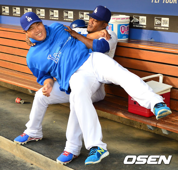 27일 (이하 한국시간) 미국 캘리포니아주 로스앤젤레스 다저스타디움에서 열린 2013 메이저리그 LA 다저스와 시카고 컵스의 경기, 다저스 덕아웃에서 류현진 유리베에게 장난을 치고 있다.