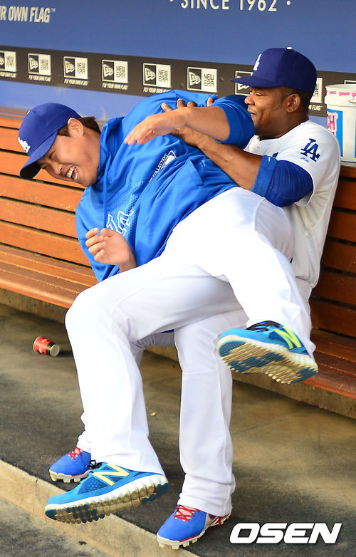 27일 (이하 한국시간) 미국 캘리포니아주 로스앤젤레스 다저스타디움에서 열린 2013 메이저리그 LA 다저스와 시카고 컵스의 경기, 다저스 덕아웃에서 류현진 유리베가 장난을 치고 있다.