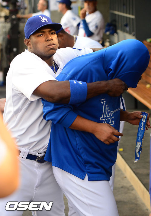 27일 (이하 한국시간) 미국 캘리포니아주 로스앤젤레스 다저스타디움에서 열린 2013 메이저리그 LA 다저스와 시카고 컵스의 경기, 다저스 덕아웃에서 푸이그가 류현진 뒤에서 류현진의 후드로 얼굴을 가리고 있다.