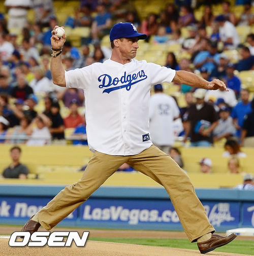27일 (이하 한국시간) 미국 캘리포니아주 로스앤젤레스 다저스타디움에서 열린 2013 메이저리그 LA 다저스와 시카고 컵스의 경기, 경기 전 헐리우드 영화 '42'에서 레오 듀로처 역을 맡았던 크리스토퍼 멜로니가 시구를 하고 있다.