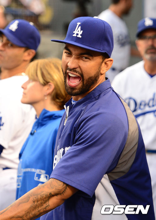 27일 (이하 한국시간) 미국 캘리포니아주 로스앤젤레스 다저스타디움에서 열린 2013 메이저리그 LA 다저스와 시카고 컵스의 경기, 덕아웃에서 맷 켐프가 포즈를 취하고 있다.