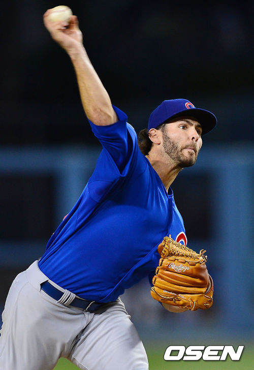27일 (이하 한국시간) 미국 캘리포니아주 로스앤젤레스 다저스타디움에서 열린 2013 메이저리그 LA 다저스와 시카고 컵스의 경기, 시카고 컵스 선발 제이크 아리에타가 힘차게 공을 뿌리고 있다.