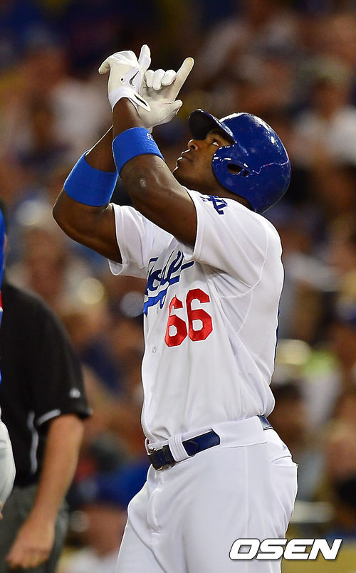 27일 (이하 한국시간) 미국 캘리포니아주 로스앤젤레스 다저스타디움에서 열린 2013 메이저리그 LA 다저스와 시카고 컵스의 경기, 3회말 1사 주자 1루 다저스 푸이그가 좌전 안타를 날린 후 1루에서 기뻐하고 있다.