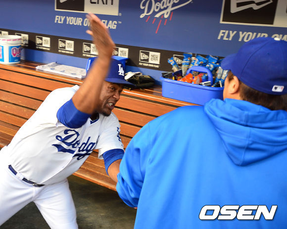 27일 (이하 한국시간) 미국 캘리포니아주 로스앤젤레스 다저스타디움에서 열린 2013 메이저리그 LA 다저스와 시카고 컵스의 경기, 다저스 덕아웃에서 유리베와 류현진이 장난을 치고 있다.