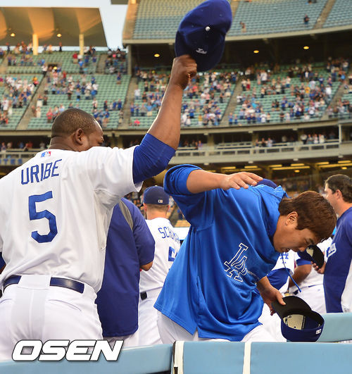 27일 (이하 한국시간) 미국 캘리포니아주 로스앤젤레스 다저스타디움에서 열린 2013 메이저리그 LA 다저스와 시카고 컵스의 경기, 다저스 덕아웃 앞에서 류현진이 유리베가 장난을 치고 있다.