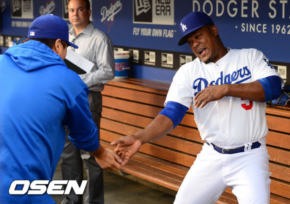 27일 (이하 한국시간) 미국 캘리포니아주 로스앤젤레스 다저스타디움에서 열린 2013 메이저리그 LA 다저스와 시카고 컵스의 경기, 다저스 덕아웃에서 유리베와 류현진이 하이파이브를 하고 있다.