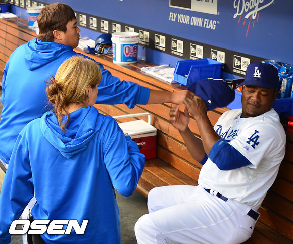 27일 (이하 한국시간) 미국 캘리포니아주 로스앤젤레스 다저스타디움에서 열린 2013 메이저리그 LA 다저스와 시카고 컵스의 경기, 다저스 덕아웃에서 유리베와 류현진이 장난을 치고 있다.