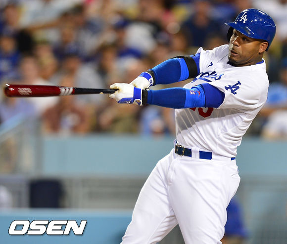 27일 (이하 한국시간) 미국 캘리포니아주 로스앤젤레스 다저스타디움에서 열린 2013 메이저리그 LA 다저스와 시카고 컵스의 경기, 4회말 2사 주자 1,3루 다저스 크로포드가 좌익선상 1타점 2루타를 날리고 있다.