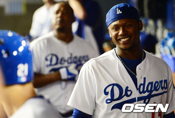 27일 (이하 한국시간) 미국 캘리포니아주 로스앤젤레스 다저스타디움에서 열린 2013 메이저리그 LA 다저스와 시카고 컵스의 경기, 4회말 2사 주자 1,2루 선취 1타점 적시타를 날린 다저스 그레인키와 라미네즈가 덕아웃에서 기쁨을 나누고 있다.