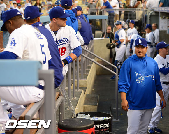 27일 (이하 한국시간) 미국 캘리포니아주 로스앤젤레스 다저스타디움에서 열린 2013 메이저리그 LA 다저스와 시카고 컵스의 경기, 다저스 류현진이 덕아웃에서 유리베에게 장난 칠 기회를 엿보며 미소짓고 있다.