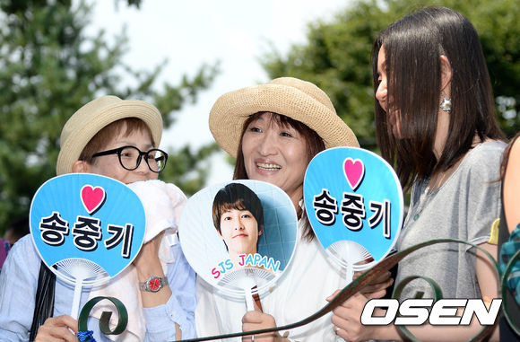 배우 송중기의 일본팬들이 응원 문구가 적힌 부채를 들고 기다리고 있다.