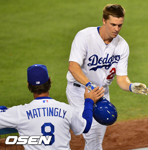 27일 (이하 한국시간) 미국 캘리포니아주 로스앤젤레스 다저스타디움에서 열린 2013 메이저리그 LA 다저스와 시카고 컵스의 경기, 6회말 무사 주자 2루 다저스 그레인키가 희생번트에 성공한 후 돈 매팅리 감독과 하이파이브를 하고 있다.