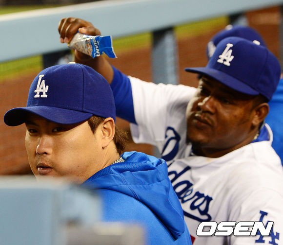 27일 (이하 한국시간) 미국 캘리포니아주 로스앤젤레스 다저스타디움에서 열린 2013 메이저리그 LA 다저스와 시카고 컵스의 경기, 류현진이 덕아웃에서 유리베에게 해바라기씨 테러를 당하고 있다.