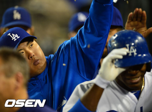 27일 (이하 한국시간) 미국 캘리포니아주 로스앤젤레스 다저스타디움에서 열린 2013 메이저리그 LA 다저스와 시카고 컵스의 경기, 8회말 2사 주자 없는 상황에서 다저스 푸이그가 좌월 솔로홈런을 날린 후 덕아웃에서 류현진이 푸이그에게 해바라기씨를 뿌리고 있다.