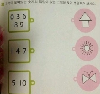 ‘흔한 유치원 산수문제’가 최근 한 온라인 커뮤니티에 공개됐다. ‘흔한 유치원 산수문제’는 각각의 모여있는 숫자의 특징에 맞는 그림을 찾아서 선으로 잇는 문제다.