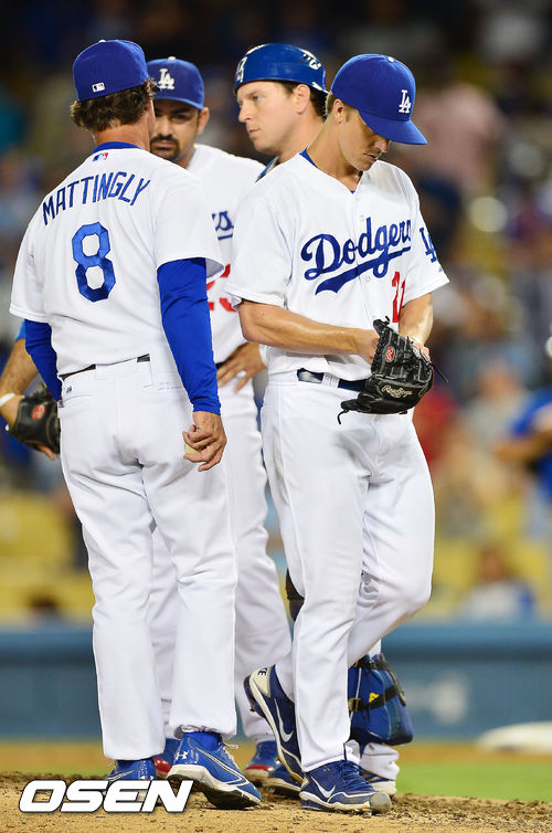 9회말 2사 주자 2루 LA 다저스 선발 그레인키가 교체되고 있다. / rumi@osen.co.kr