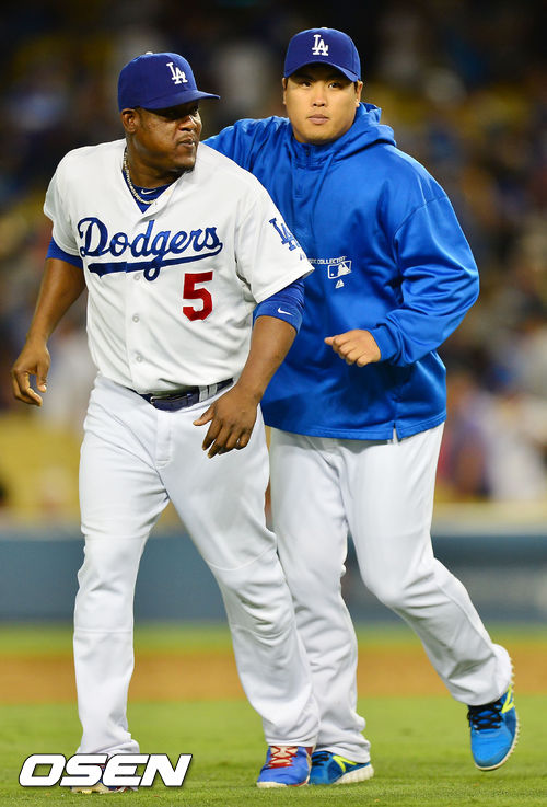 경기를 마치고 유리베와 류현진이 기뻐하며 퇴장하고 있다. / rumi@osen.co.kr