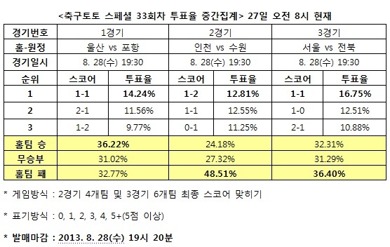 [축구토토] 국민체육진흥공단(www.kspo.or.kr)이 발행하는 체육진흥투표권 수탁사업자인 스포츠토토 공식 온라인 발매 사이트인 베트맨(www.betman.co.kr)은 오는 28일에 펼쳐지는 울산-포항(1경기), 인천-수원(2경기), 서울-전북(3경기)전 등 K리그 클래식 3경기를 대상으로 한 축구토토 스페셜 33회차 투표율 중간집계 결과, 축구팬의 48.51%는 2경기 인천-수원전에서 인천이 고전 할 것으로 전망했다고 밝혔다.