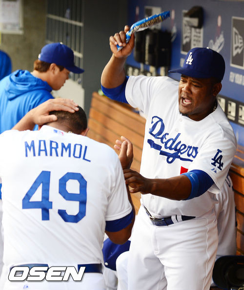 덕아웃에서 유리베가 마몰을 해바라기씨로 때리고 있다. / rumi@osen.co.kr