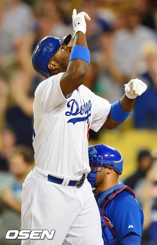 8회말 2사 주자 없는 상황에서 다저스 푸이그가 좌월 솔로홈런을 날린 후 홈에서 기뻐하고 있다. / rumi@osen.co.kr