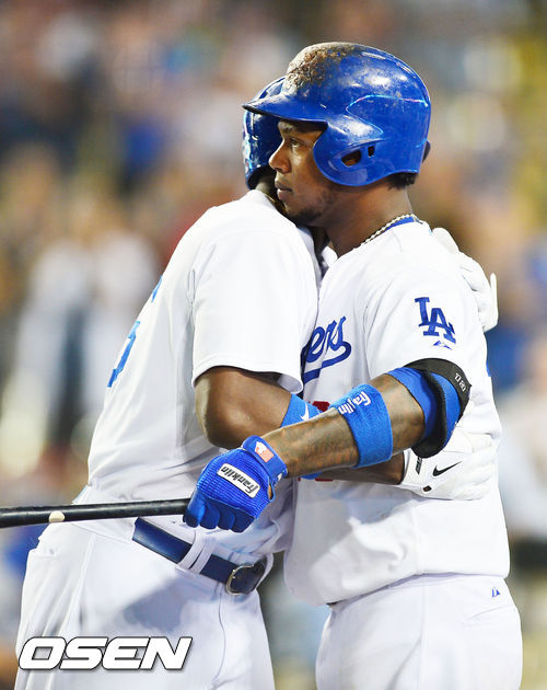 8회말 2사 주자 없는 상황에서 다저스 푸이그가 좌월 솔로홈런을 날린 후 라미레스와 포옹을 하고 있다. / rumi@osen.co.kr