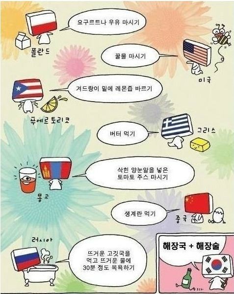 최근 한 온라인 커뮤니티에 올라온 '나라별 해장 방법' 게시물이 많은 관심을 받고 있다. '나라별 해장 방법'에는 미국과 폴란드, 푸에르토리코, 그리스, 몽골, 중국, 러시아, 한국 등 8개국에서 애용하는 해장 방법이 담겨 있다.