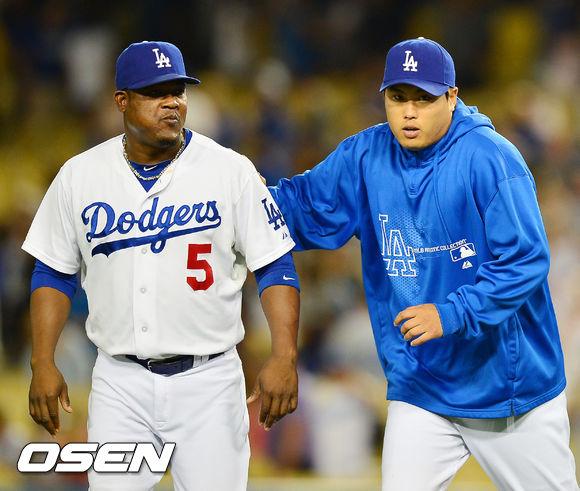 경기를 마치고 류현진과 유리베가 승리의 기쁨을 나누고 있다./ rumi@osen.co.kr