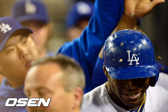 8회말 2사 주자 없는 상황에서 다저스 푸이그가 좌월 솔로홈런을 날리고 덕아웃에서 류현진에게 해바라기씨 세례를 받고 있다. / rumi@osen.co.kr