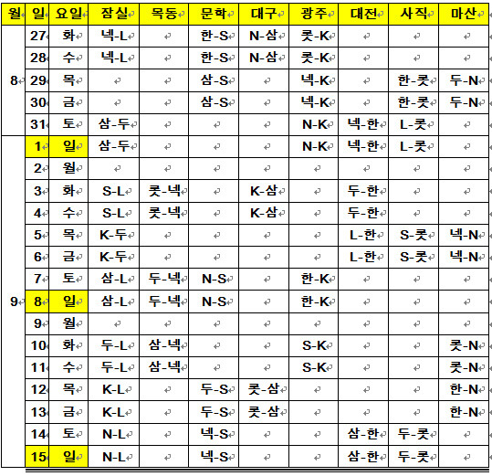 KBO(총재 구본능)는 미편성된 8경기와 8월 25일(일)까지 우천 순연된 49경기를 합한 총 57경기에 대한 일정을 별첨과 같이 확정 발표하였다.