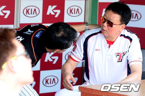 27일 오후 광주 무등경기장에서 열리는 '2013 한국야쿠르트 세븐 프로야구' KIA 타이거즈와 롯데 자이언츠의 경기, 경기에 앞서 롯데 김시진 감독과 KIA 선동렬 감독이 더그아웃에서 이야기를 나누고 있다.