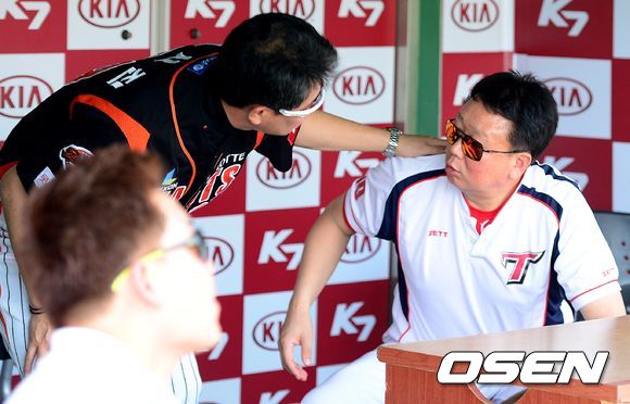 27일 오후 광주 무등경기장에서 열리는 '2013 한국야쿠르트 세븐 프로야구' KIA 타이거즈와 롯데 자이언츠의 경기, 경기에 앞서 롯데 김시진 감독과 KIA 선동렬 감독이 더그아웃에서 이야기 나누고 있다.