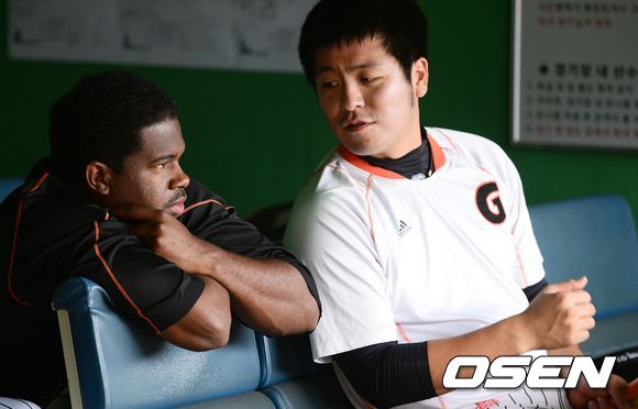 27일 오후 광주 무등경기장에서 열리는 '2013 한국야쿠르트 세븐 프로야구' KIA 타이거즈와 롯데 자이언츠의 경기, 경기에 앞서 롯데 유먼과 강민호가 더그아웃에서 이야기 나누고 있다.