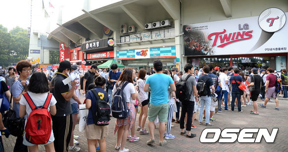27일 오후 서울 잠실야구장에서 열린 2013 한국야쿠르트 세븐프로야구 LG 트윈스와 넥센 히어로즈의 경기, 경기에 앞서 LG 팬들이 유광점퍼를 구입하기 위해 용품점 앞에 줄을 서 있다.