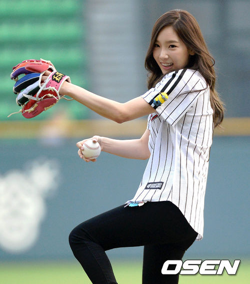 27일 오후 서울 잠실야구장에서 열린 2013 한국야쿠르트 세븐프로야구 LG 트윈스와 넥센 히어로즈의 경기, 경기에 앞서 소녀시대 태연이 시구를 하고 있다.