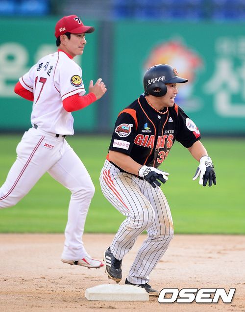 27일 오후 광주 무등경기장에서 열린 '2013 한국야쿠르트 세븐 프로야구' KIA 타이거즈와 롯데 자이언츠의 경기, 1회초 2사 1루에서 롯데 손아섭이 2루 도루를 시도했지만 KIA 안치홍에 태그아웃 당하고 아쉬워하고 있다.