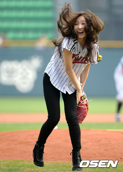 27일 오후 서울 잠실야구장에서 열린 2013 한국야쿠르트 세븐프로야구 LG 트윈스와 넥센 히어로즈의 경기, 경기에 앞서 소녀시대 태연이 시구를 하고 있다.