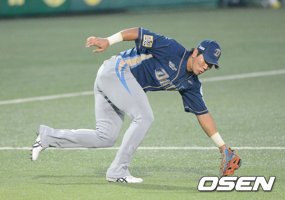 27일 오후 대구구장에서 열린 '2013 한국야쿠르트 세븐 프로야구' 삼성 라이온즈 와 NC 다이노스 경기, 2회말 2사 김태완의 2,3루간 안타성 타구를 NC 모창민이 수비를 펼치며 1루에 송구 아웃처리시키고 있다.