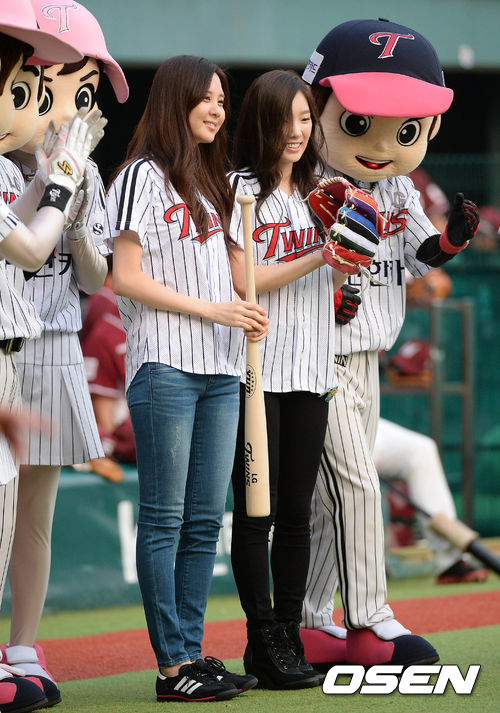 27일 오후 서울 잠실야구장에서 열린 2013 한국야쿠르트 세븐프로야구 LG 트윈스와 넥센 히어로즈의 경기, 경기에 앞서 소녀시대 서현과 태연이 시타 시구를 위해 경기장으로 들어가고 있다.